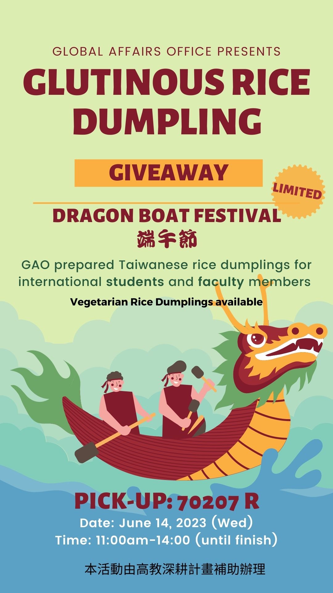 We are pleased to announce a special event to celebrate the Dragon Boat Festival. We will be distributing traditional glutinous rice dumplings to our international students and foreign faculty members as a gesture of appreciation.