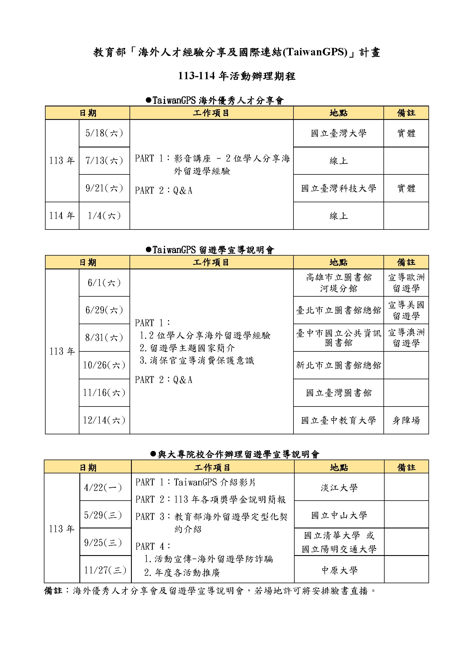 113-114年度活動訊息將公布於TaiwanGPS官網 (https://twgps.moe.edu.tw/),歡迎同學加入TaiwanGPS會員,可透過定期發送之電子報獲取教育部各項獎學金申請及最新留遊學資訊,為出國留遊學做好準備。